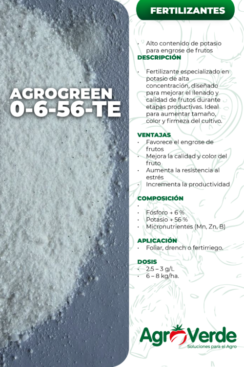 Fertilizante especializado en potasio de alta concentración, diseñado para mejorar el llenado y calidad de frutos durante etapas productivas. Ideal para aumentar tamaño, color y firmeza del cultivo.